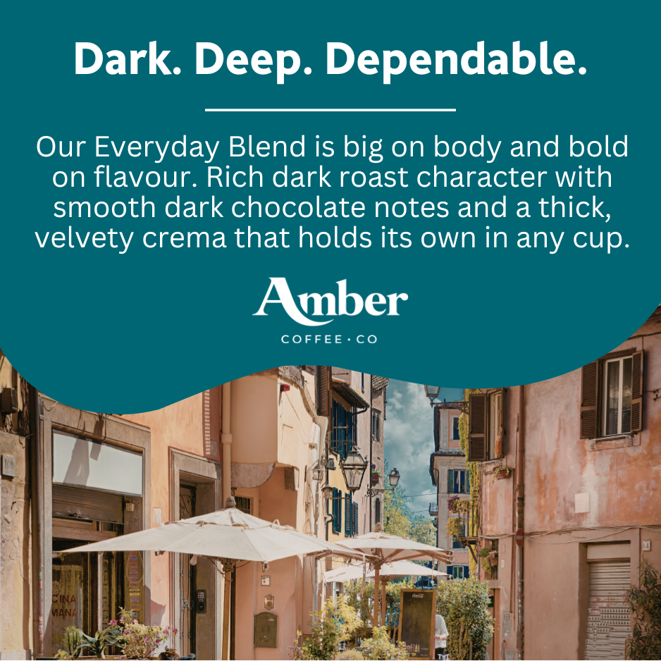 Our everyday blend brings forth a symphony of flavour, wrapped in the robust body of a dark roast. It unveils a cascade of bold, rich darkness, punctuated by delicate whispers of dark chocolate notes - a veritable ballet of sensory delight.