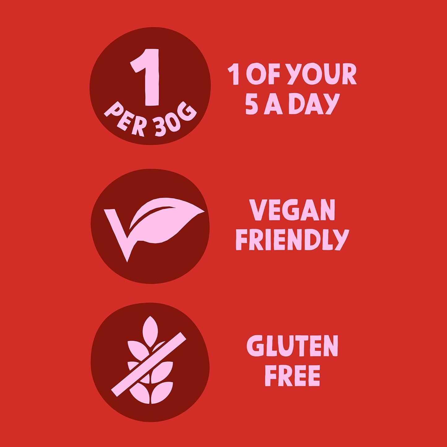 We like our Strawberries Pure. No sugars, no preservatives, nothing. All we do is gently bake the fruit so it’s easier to munch on the move. Delicious fruit, picked when it’s perfectly ripe and then gently baked at low temperatures so that you hang on to all the good stuff. We will never add any sugar, oils, sulphites, concentrates or any other funny business to our fruit. It is the ideal food for people on the go.