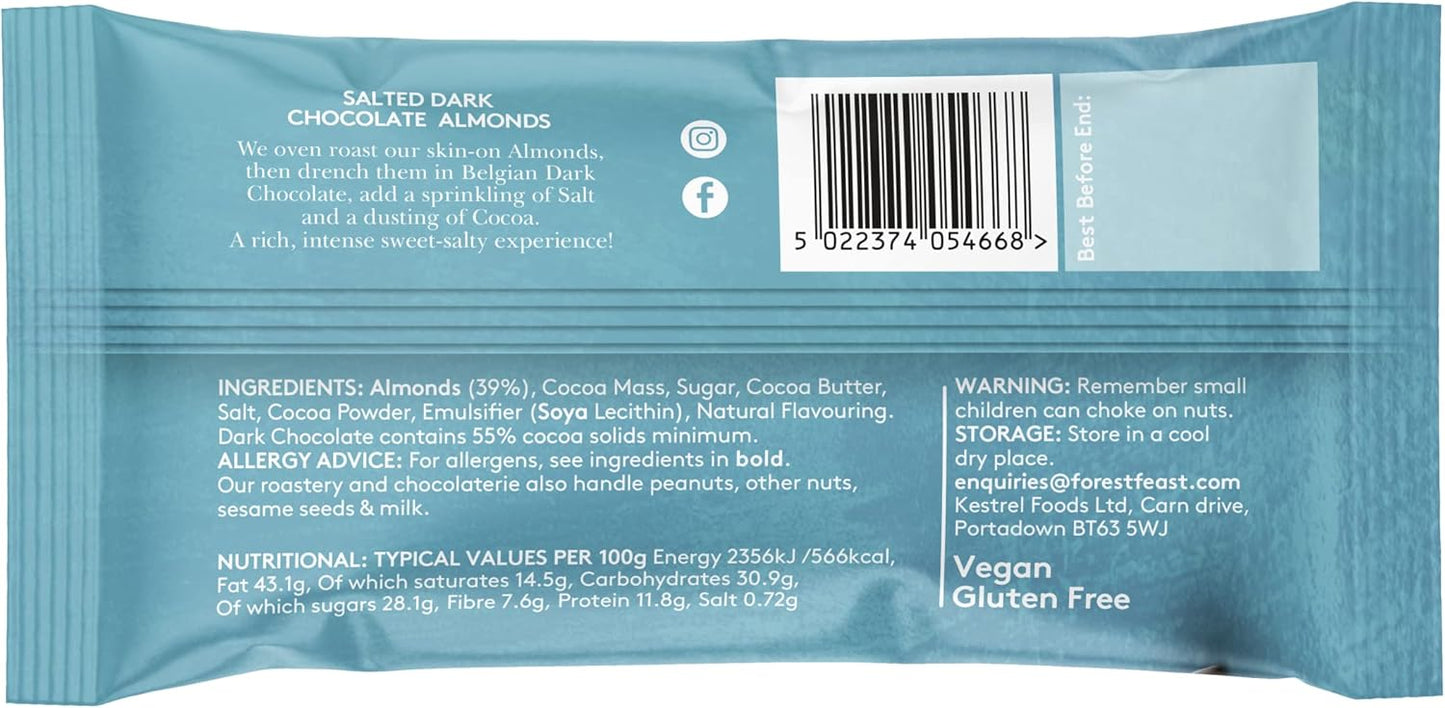 Forest Feast Salted Dark Chocolate Almonds combine crunchy roasted almonds with rich dark chocolate and a subtle hint of sea salt. The sweet and salty pairing creates a satisfying snack with depth and balance in every bite. Perfect for a mid-day treat or an indulgent nibble on the go. Supplied in a pack of 12, great for sharing or stocking up.