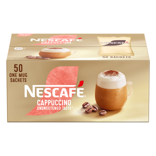 NESCAFÉ Cappuccino Unsweetened Taste* sticks are a delicious coffee shop-style drink for those who prefer a less sweet taste. Enjoy an expertly prepared cappuccino which is made using a blend of roasted coffee beans and fresh milk from British dairy farmers.
