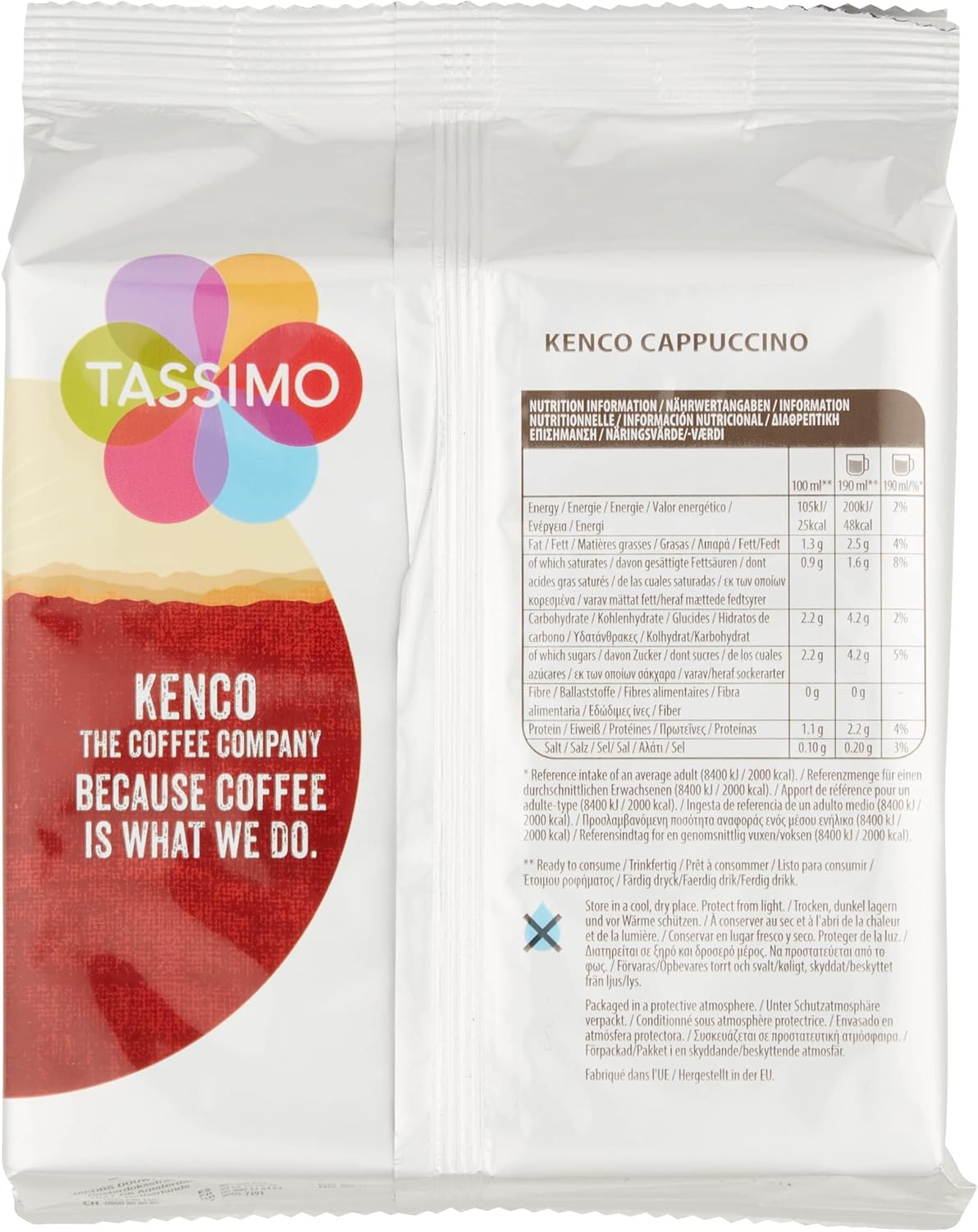 Contains 16 T-Discs for 8 delicious drinks. Use 1 T-Disc roast and ground coffee and 1 T-Disc concentrated ultra-filtered milk-preparation with sugar for your Kenco Cappuccino