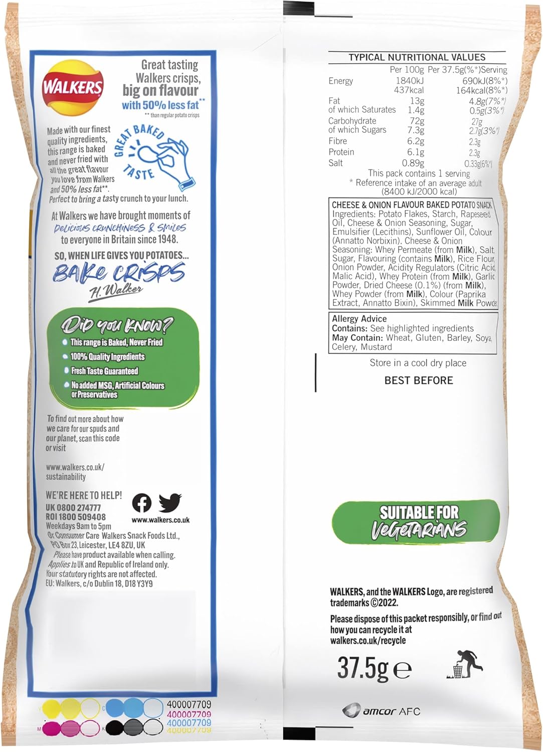 Walkers Baked Cheese & Onion Crisps offer a lighter alternative to traditional crisps, with 50% less fat and the same great flavour. Baked to perfection, each crisp is packed with the classic tangy cheese and onion taste. Ideal for lunchboxes, snacking at work, or enjoying on the go. Supplied in a 32 pack, perfect for sharing or stocking up.