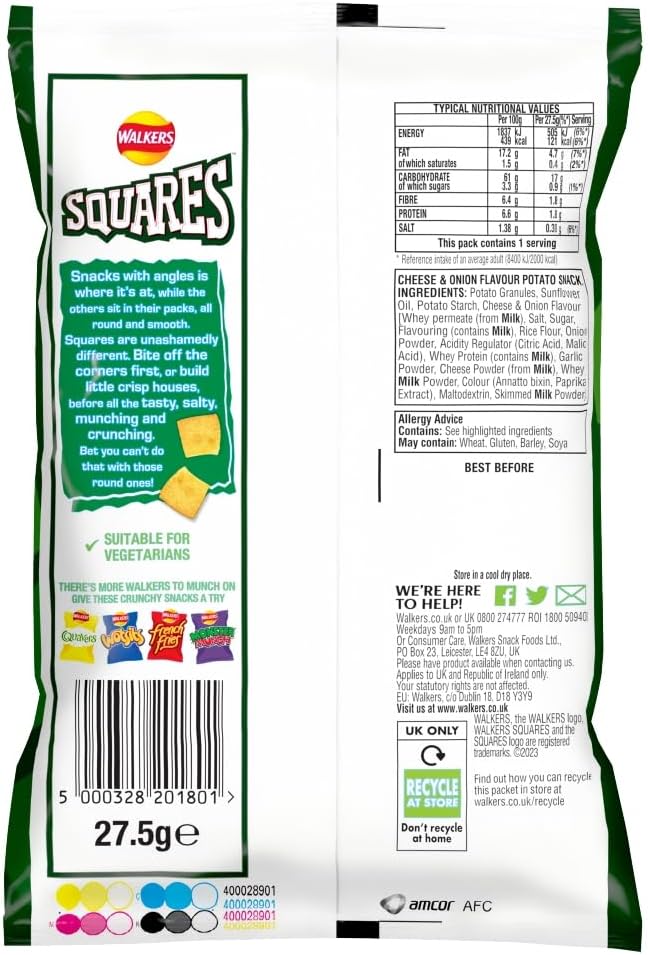 Walkers Squares Cheese & Onion Crisps are deliciously crunchy with a light texture and a classic flavour twist. Their unique square shape delivers a playful crunch packed with tangy cheese and onion seasoning. Perfect for lunchboxes, snack breaks, or on-the-go nibbling. Supplied in a 32 pack, ideal for sharing or stocking up.
